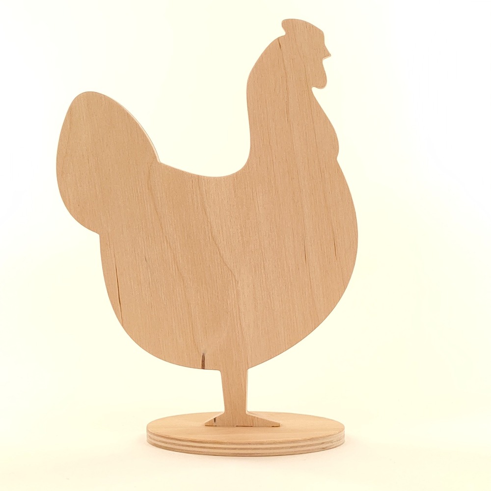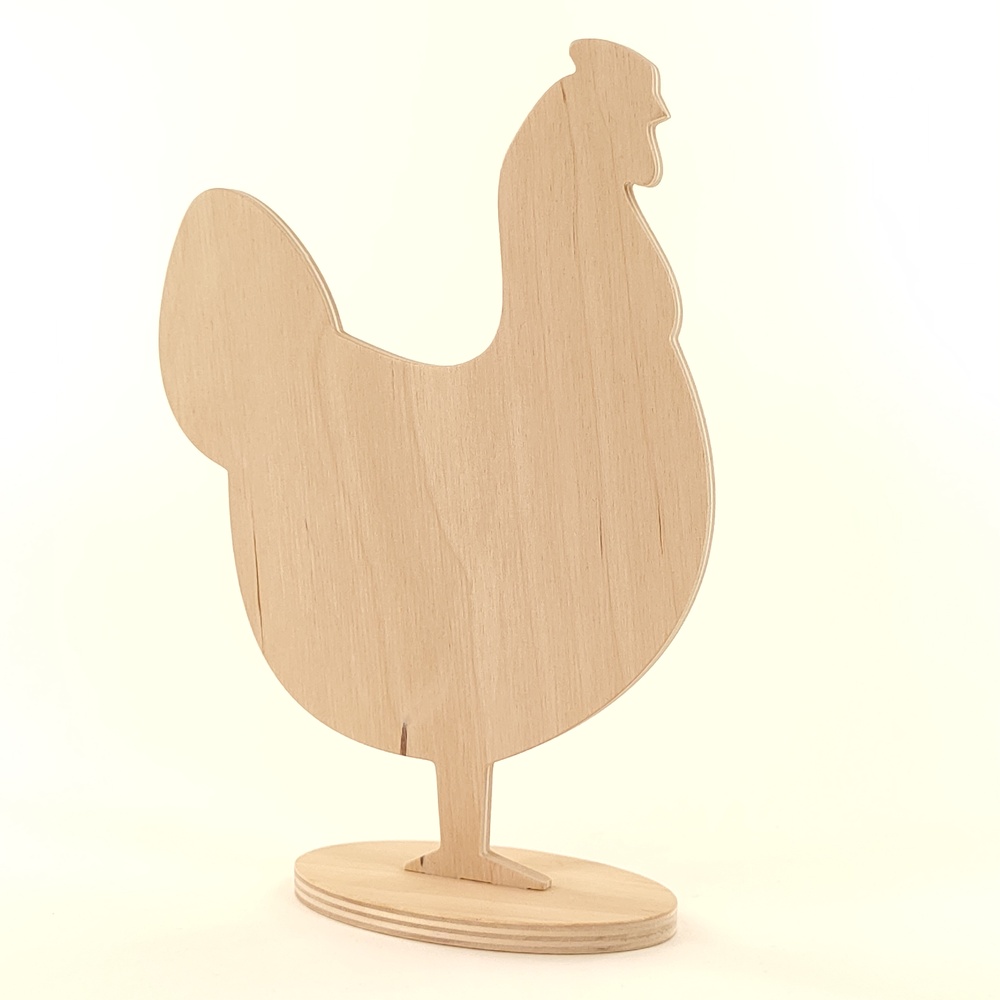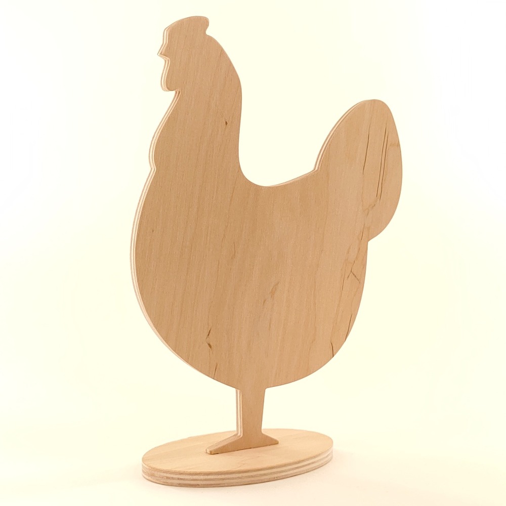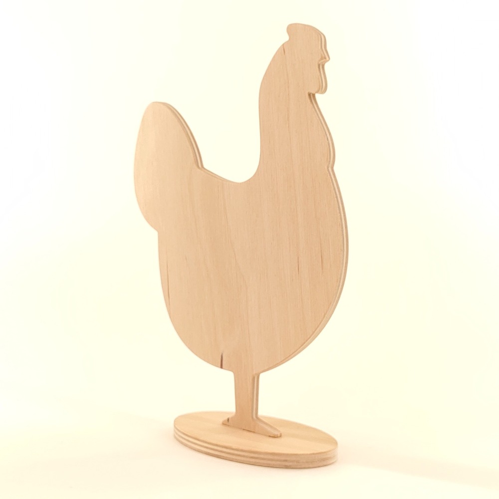 Stojak kura, drewniana dekoracja wielkanocna wykonana ze sklejki brzozowej o grubości 6mm na stabilnej owalnej podstawce.