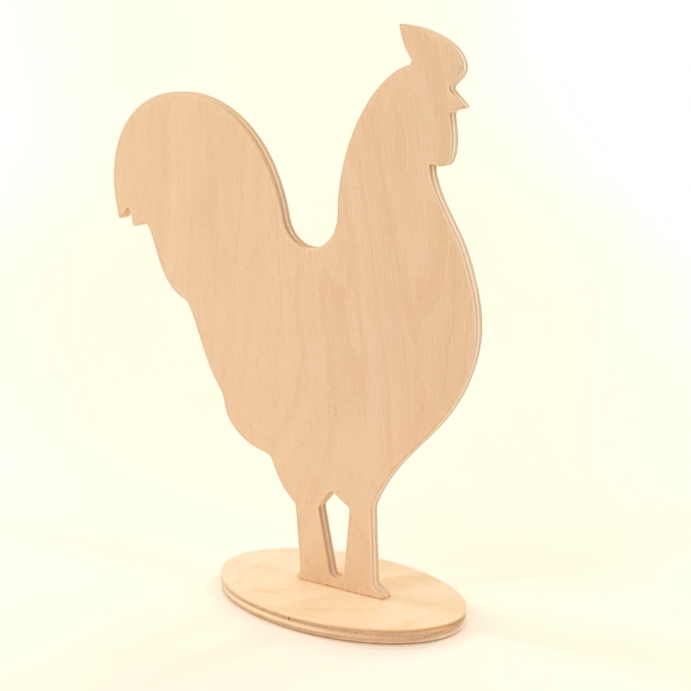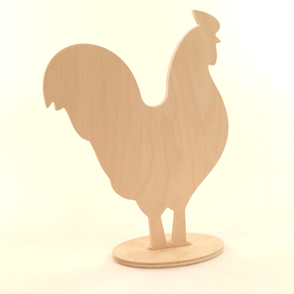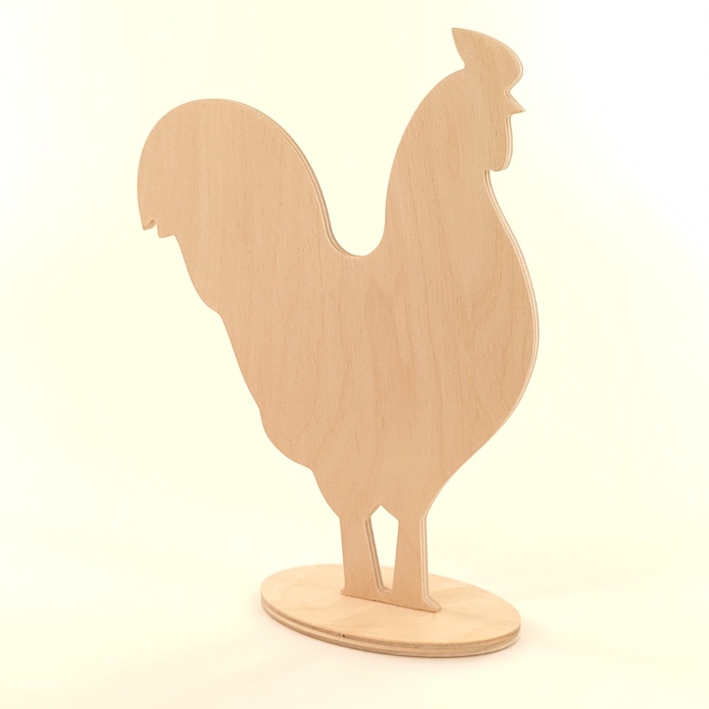 Stojak kogut, drewniana dekoracja wielkanocna wykonana ze sklejki brzozowej o grubości 6mm na stabilnej owalnej podstawce.