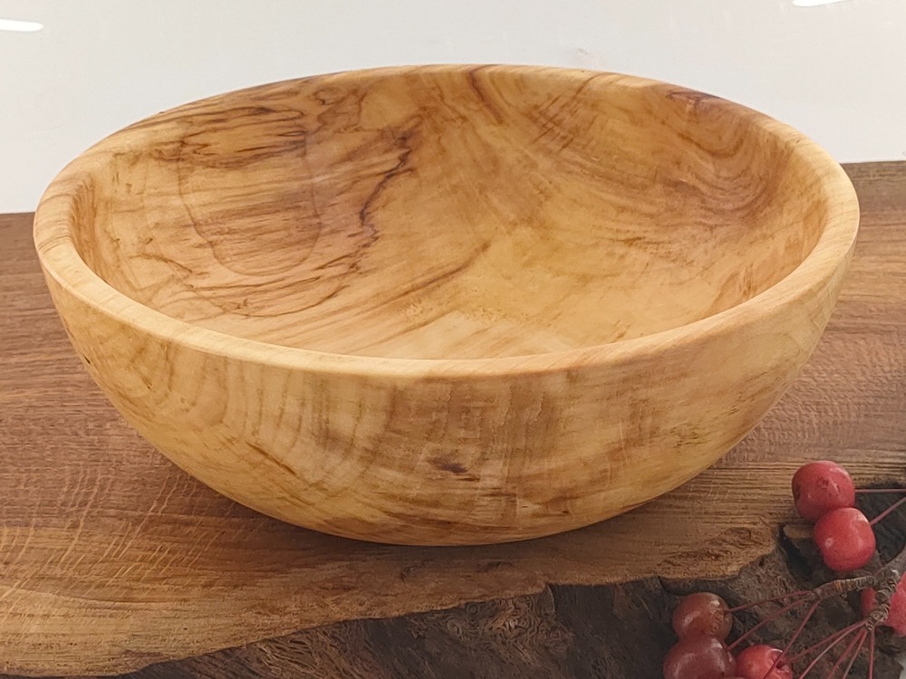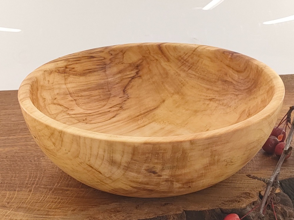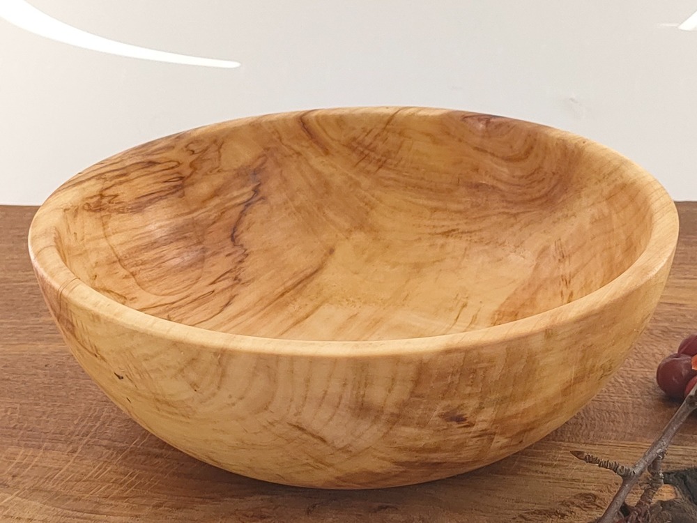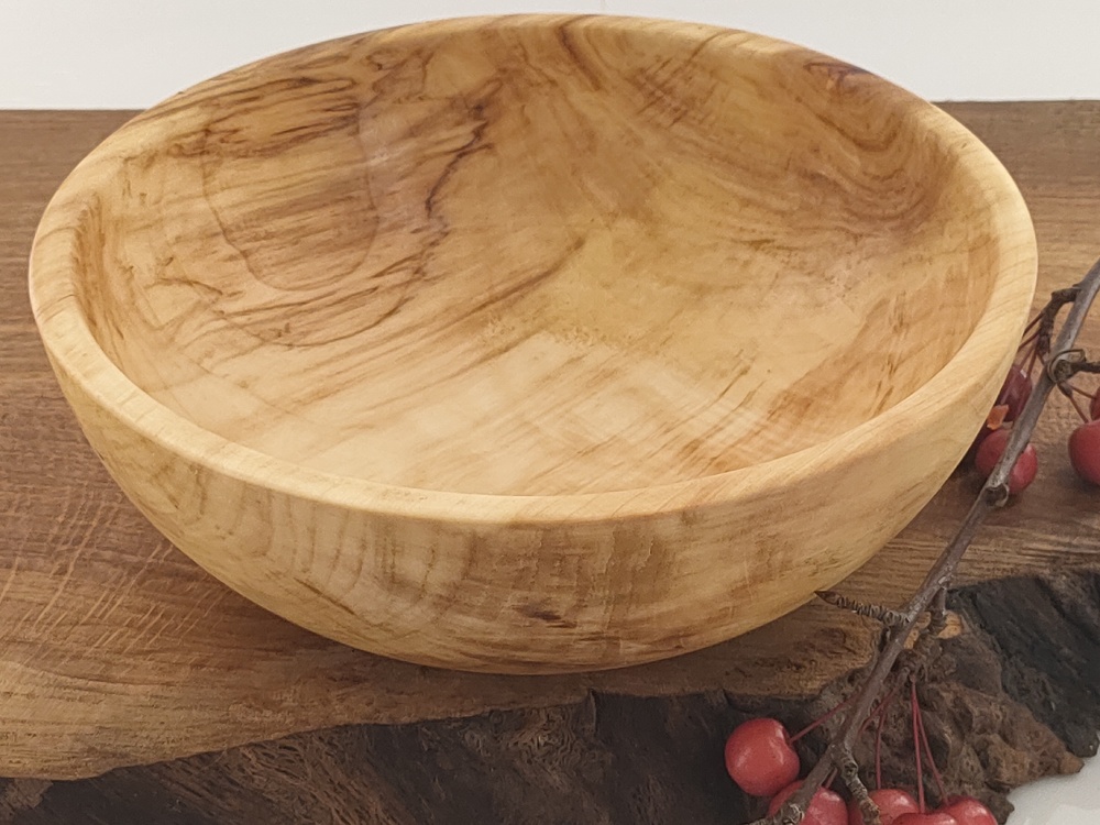 Kod produktu: 983 Nr 096Ręcznie toczona w naszej pracowni misa z klonu ze spaltingiem – drewna, w którym natura sama namalowała swoje wzory. Delikatne przejścia kolorów od kremowego po ciepłe brązy przeplatają się z ciemnymi liniami grzybni, tworząc niepowtarzalny, niemal malarski układ.