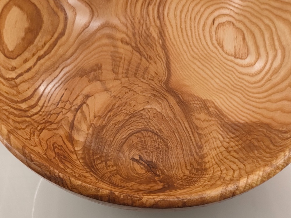 Cechy: duża misa, ręcznie wykonana, z jednego kawałka pięknego, twardego starego jesionu, bogate przejścia tonalne, sęki i ciekawe słoje