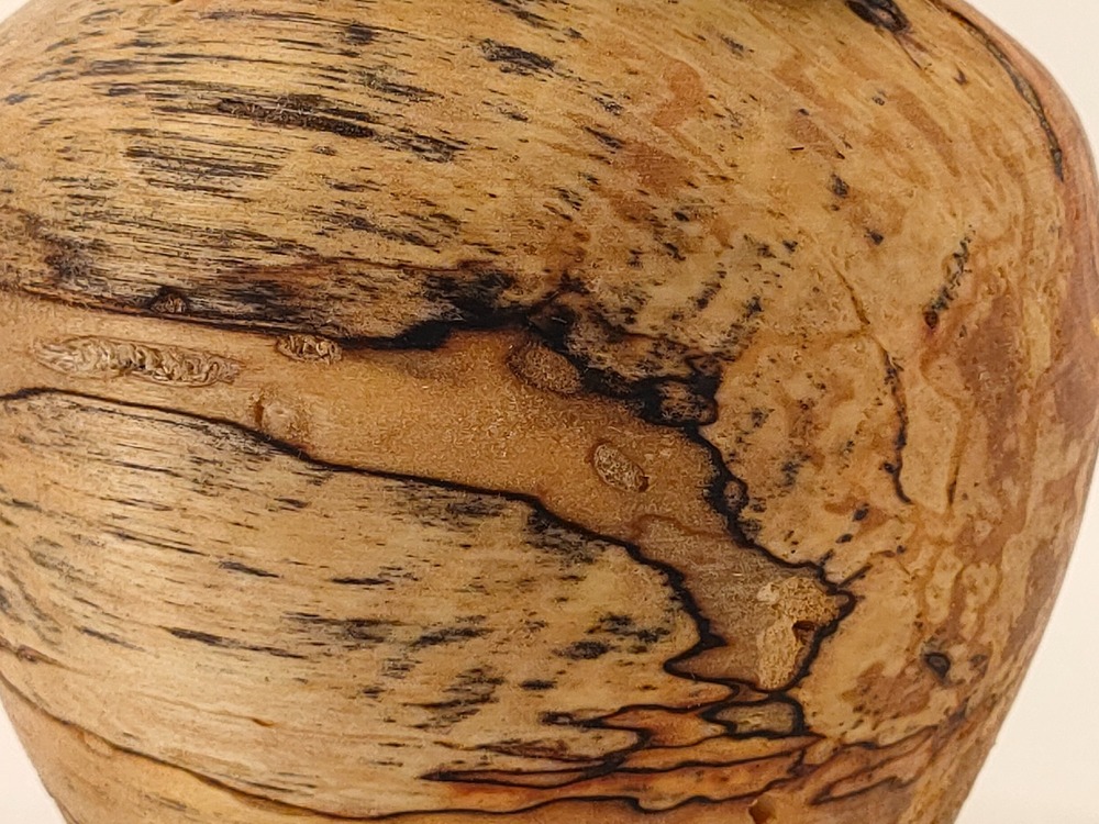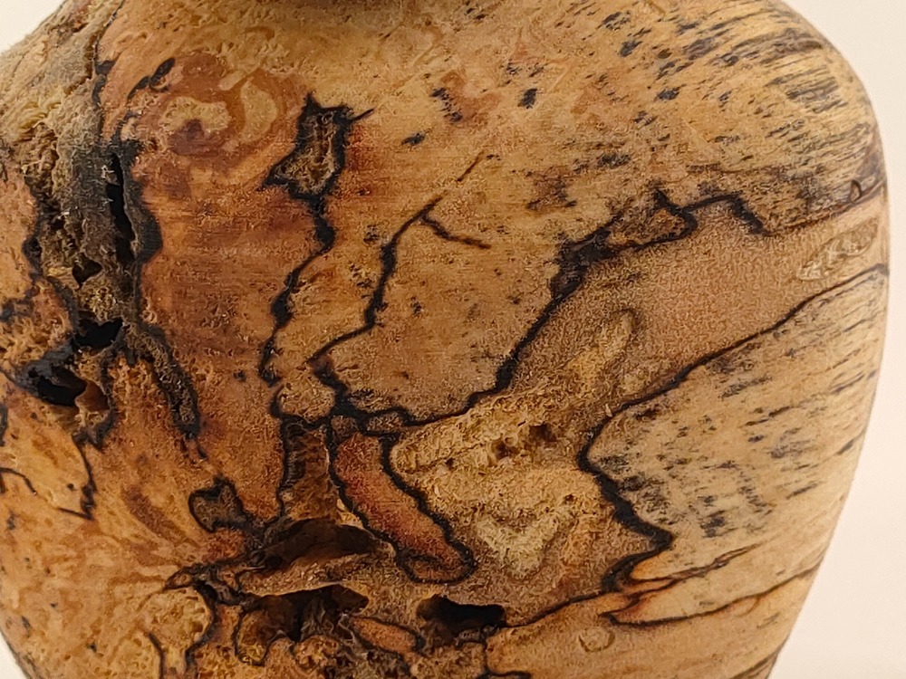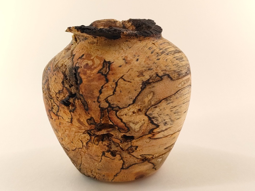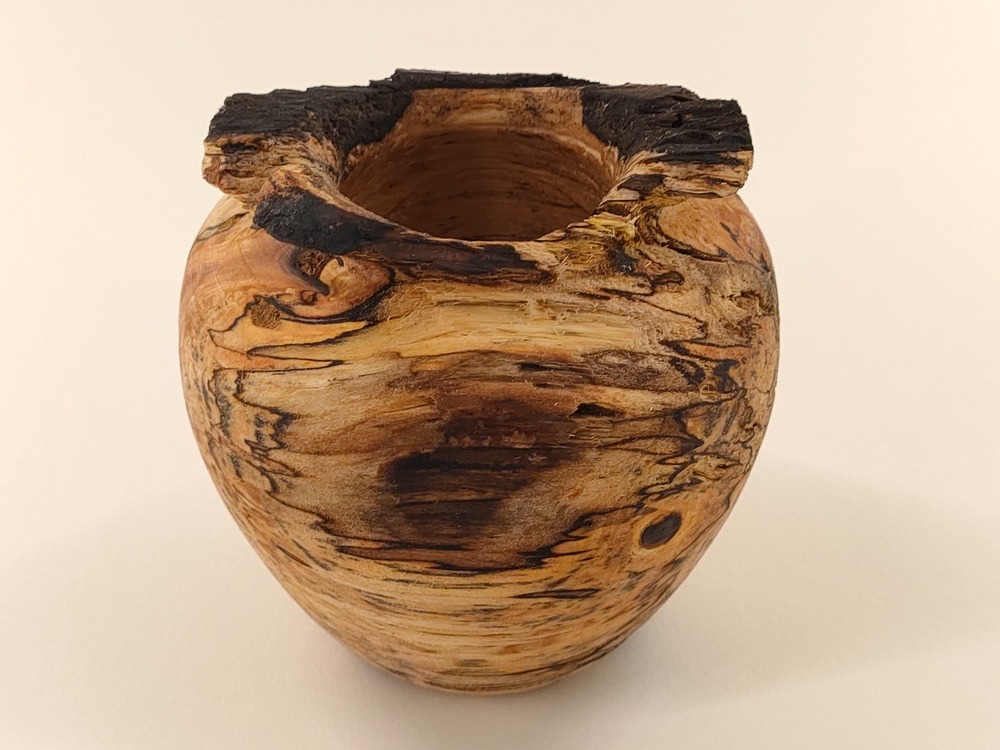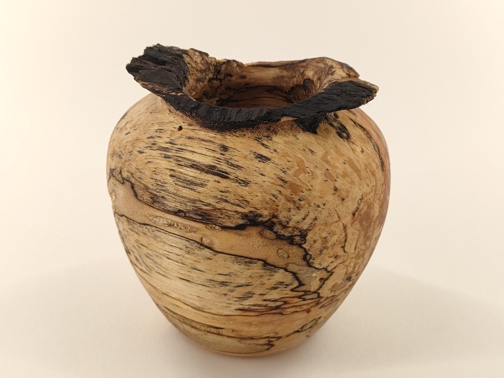 Kod produktu: 991 Nr 089Ręcznie toczony wazon z brzozy ze spaltingiem, pełen kolorów i naturalnych wzorów drewna. Kształt przypomina klasyczną amforę z wąską podstawą, a pozostawiony fragment czarnej kory przy wlocie dodaje mu wyjątkowego charakteru.