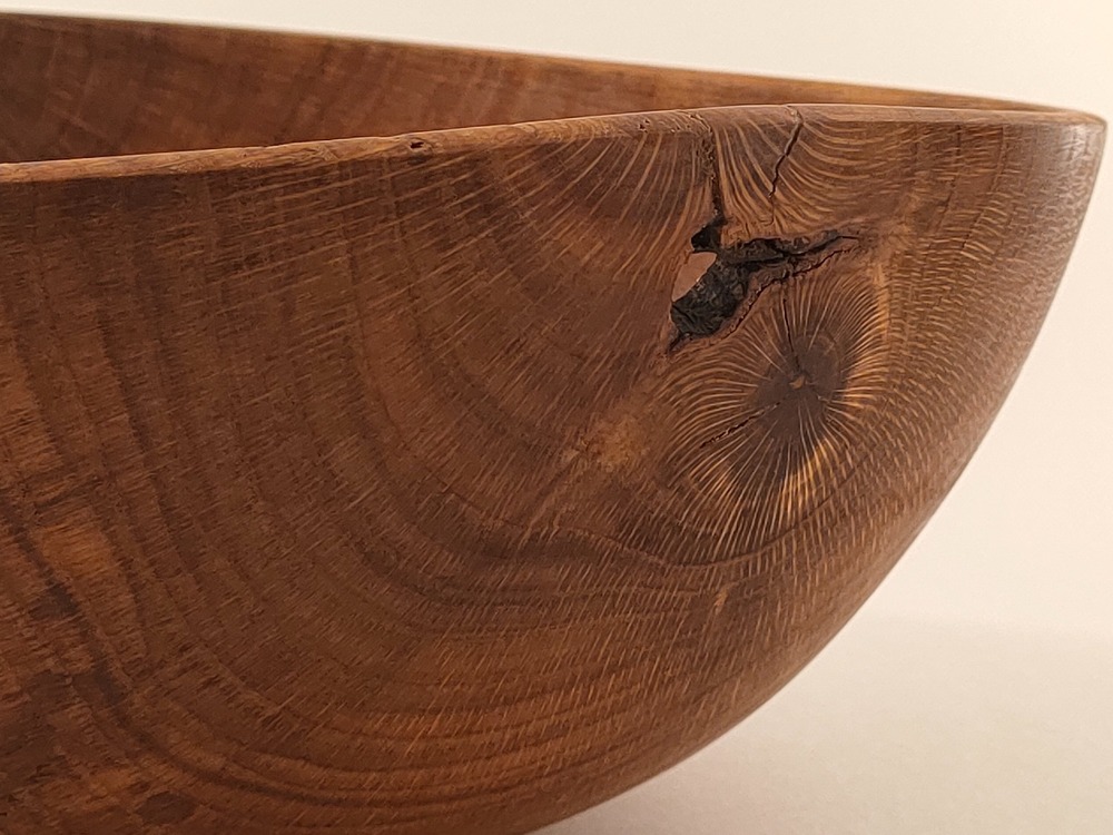 Cechy: ręcznie wykonana, naturalna fala na rancie, cieniutkie ścianki, dziura po sęku, stary dąb